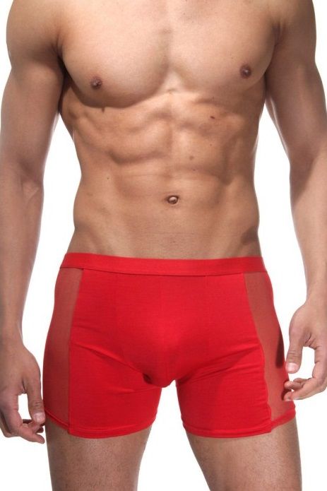 Красные гладкие трусы-боксеры для мужчин. Резинка у трусов широкая, по бокам полупрозрачные вставки.