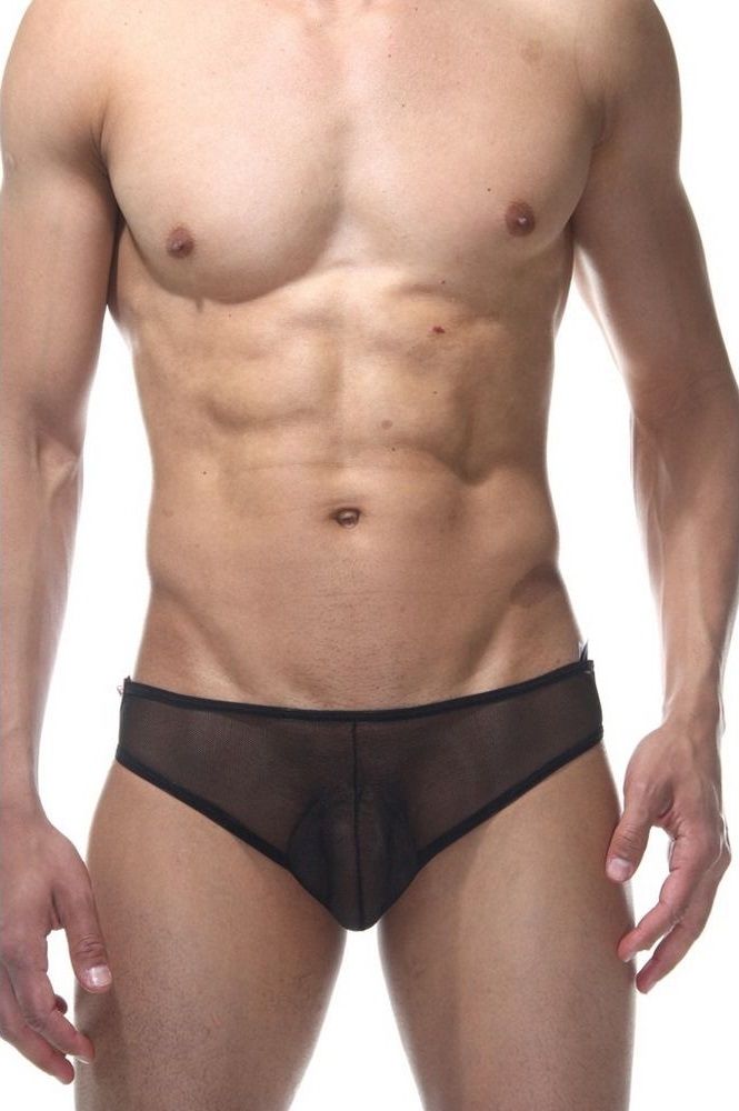 Мужские слипы, на ягодицах у которых три ряда кружев. Спереди трусы классической формы, из полупрозрачного черного материала.