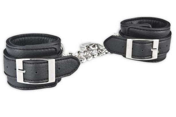Черные оковы для запястий из суперкачественной искусственной кожи. Все швы прострочены, металлические детали надежно закреплены. Два браслета соединяются между собой металлической цепью с прочным замком. Размер браслетов регулируется ремешком. Ширина наручника - 5 см.
