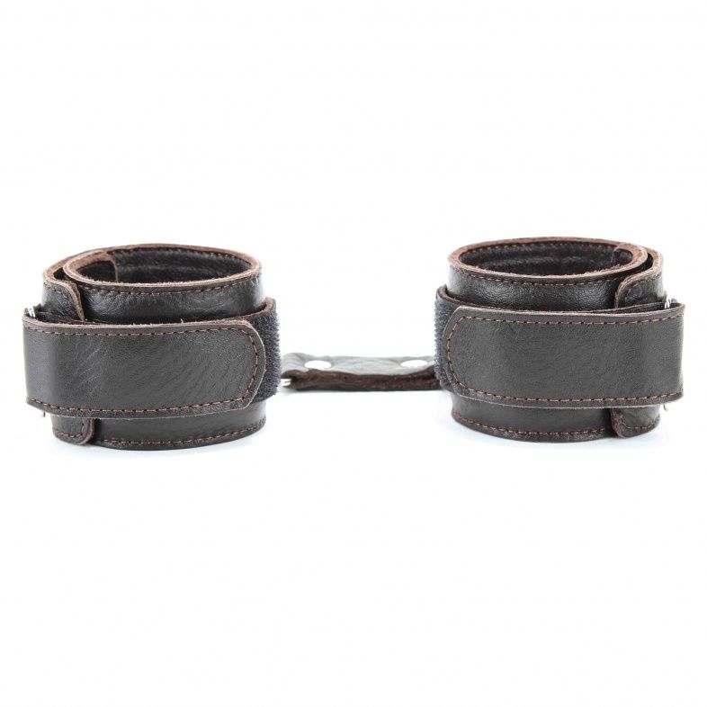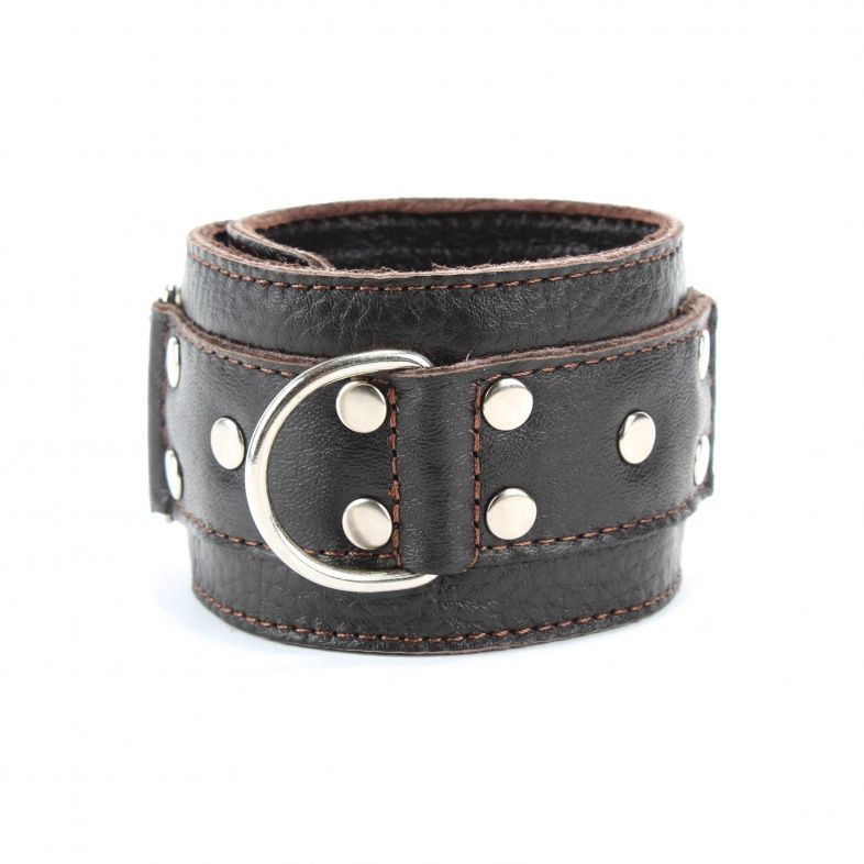 Кожаные наручники потрясающего коричневого цвета.Украшены заклепками и соединяются между собой цепью с карабинами. Размер наручников регулируется при помощи застежки-липучки Ширина - 5 см.