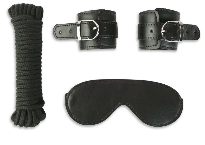 Старт-набор для тех, кто хочет начать «карьеру БДСМ»! универсальная атрибутика, без которой не обойдется ни одна ролевая игра – 2 пары манжет, закрытая маска на глаза и верёвка для связывания. Маска и манжеты выполнены из качественного кожзаменителя. Манжеты могут использоваться в качестве наручников и фиксаторов для ног, к ним стоит всего лишь привязать верёвку. Чтобы обострить ощущения и сделать каждое движение партнера для себя сюрпризом, наденьте маску. Длина верёвки - 900 см. Длина наручников - 28 см. Максимальный обхват - 25 см.